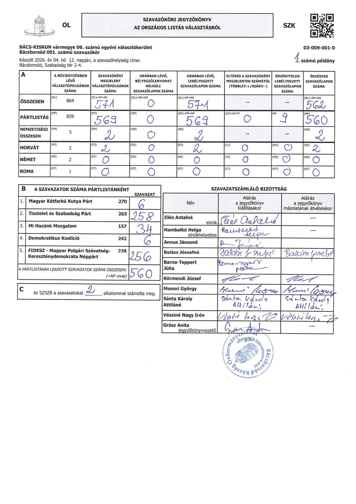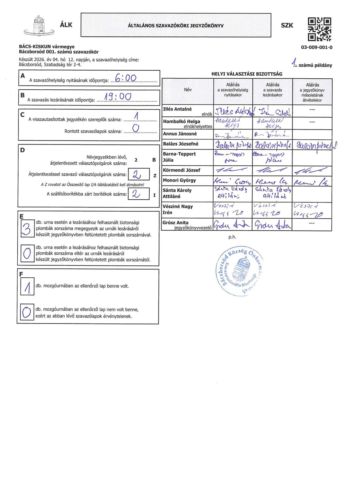 Bácsborsód 001. számú szavazókör eredmény jegyzőkönyvei a 2026. évi országgyűlési képviselők választásáról Csatolmány(ok): egyéni251.65 KB országos293.11 KB